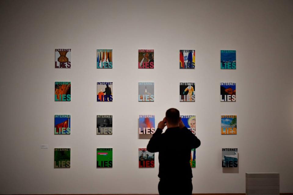 عبارته الساخرة “الإنترنت يكذب” التي تتكرر في لوحات معرضنا، وربما